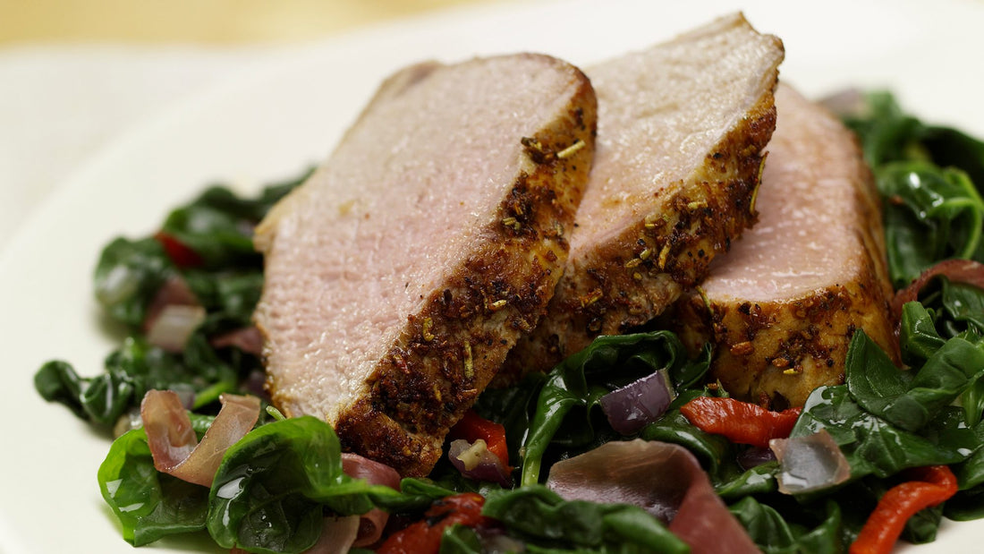 Rosemary Pork Tenderloin on a Bed of Spinach, Roasted Red Peppers and Prosciutto