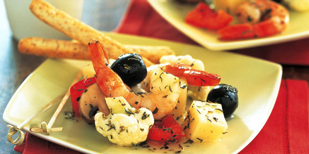 1. Place shrimp, cheese, vegetables and olives in large resealable plastic bag or glass dish. Mix remaining ingredients in small bowl. Pour over shrimp and vegetables; toss to coat well.