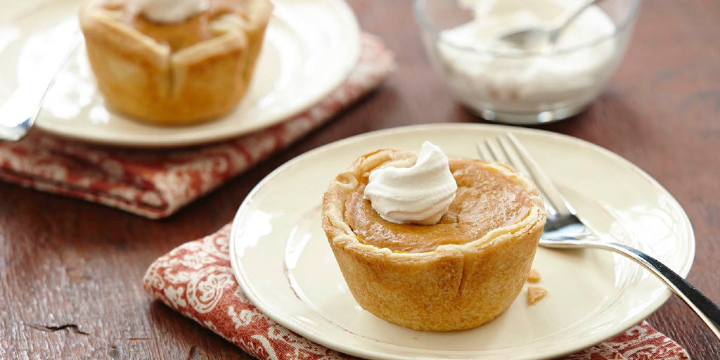 1. Preheat oven to 375ยฐF. For the Mini Pumpkin Pies, unroll crusts on lightly floured surface. Using a 3 1/2-inch round cutter, cut out 6 rounds from each crust. Re-roll scraps as necessary. Press dough rounds into muffin pan sprayed with no stick cooking spray. Set aside.