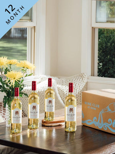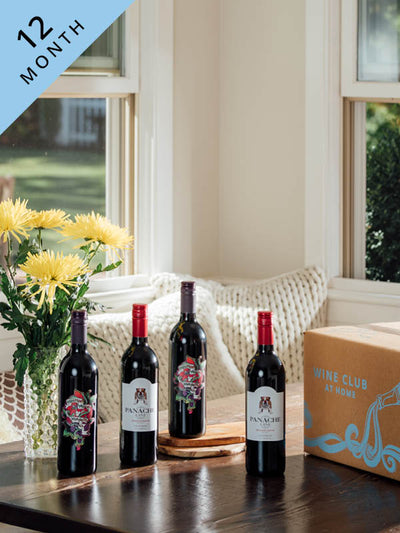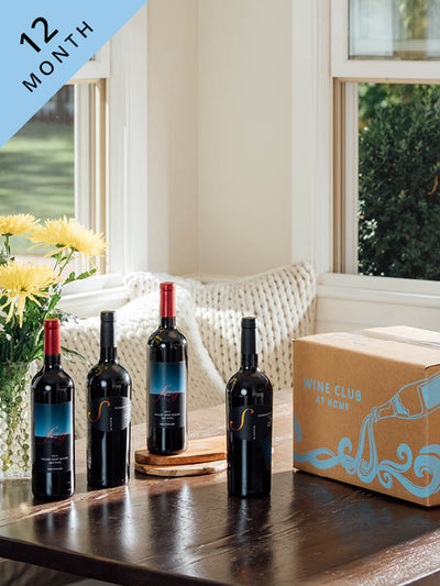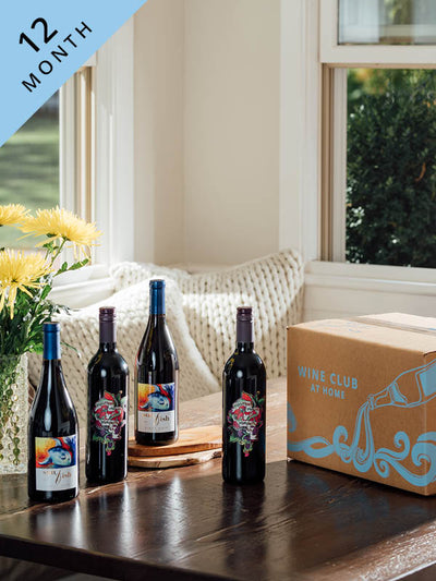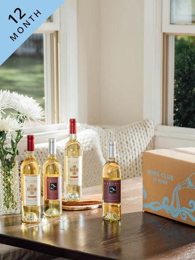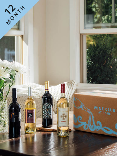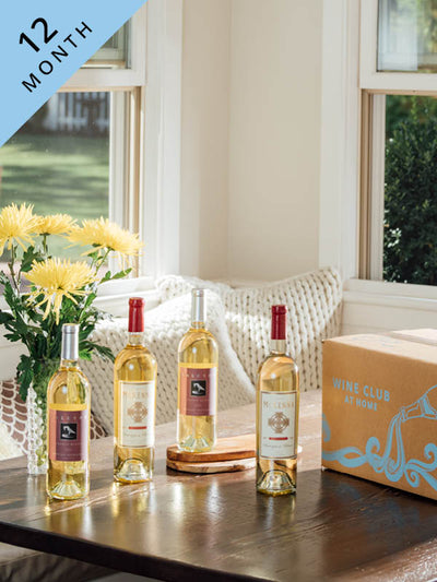 2 white and 2 red WineShop At Home wines for 12-Month Wine Club displayed on kitchen table with the Wine Club box.