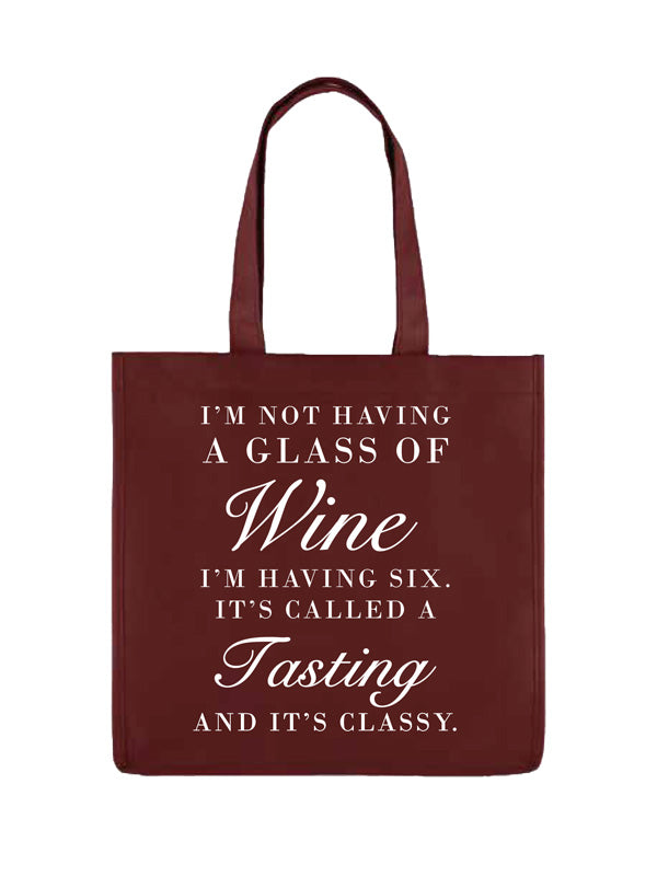 Keep it classy and sassy with our 6-bottle tote with the quote, "I'm not having a glass of wine, I'm having six. It's called a Tasting and it's classy." It's the perfect accessory with a gift of 6 bottles of wine!