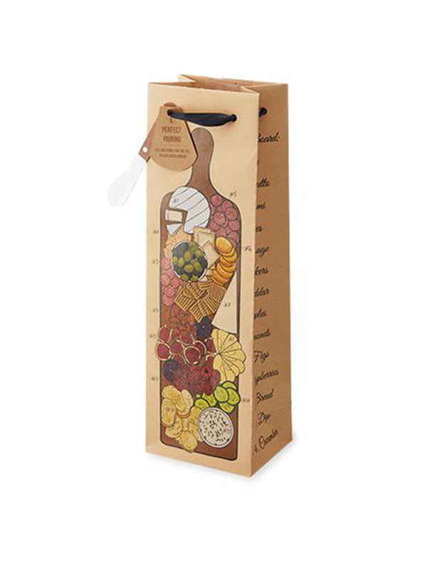 A gift bag that looks good enough to eat! This handy wine bag showcases how to build a classic charcuterie board. Includes a fun gift tag in the shape of a cheese knife.