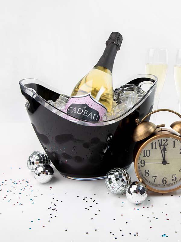 This simple, modern ice bucket can hold up to two of your favorite bottles. Made of durable black acrylic, it features two handles for easy transport.